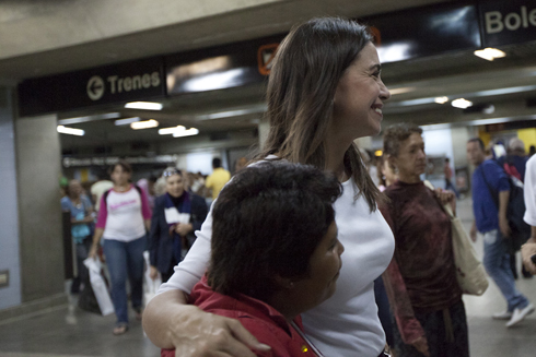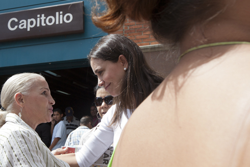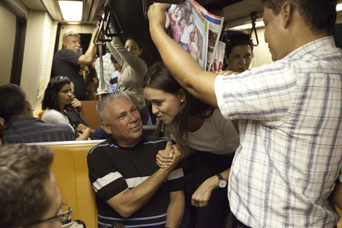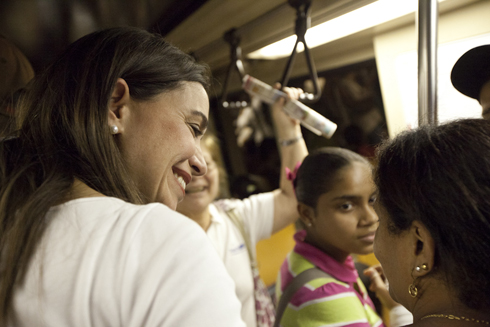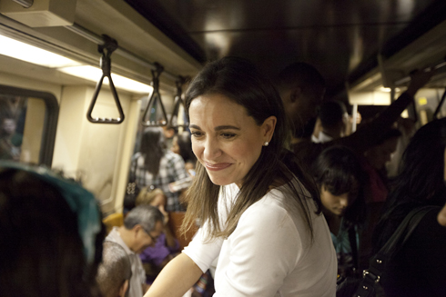 La precandidata presidencial, María Corina Machado, se subió este viernes en el Metro de Caracas. Aunque Machado viajó de la estación Los Cortijos hasta Capitolio, señaló que su próxima estación será Miraflores en 2012.